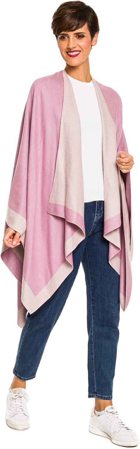 Women’s Shawl Wrap Poncho Ruana Cape Cardigan Sweater Open Front for Fall Winter(Border Design – Double Pink)