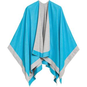 Women’s Shawl Wrap Poncho Ruana Cape Cardigan Sweater Open Front for Fall Winter(Border Design – Blue and Gray)