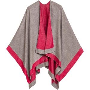 Women’s Shawl Wrap Poncho Ruana Cape Cardigan Sweater Open Front for Fall Winter(Border Design – Fuschia and Gray)