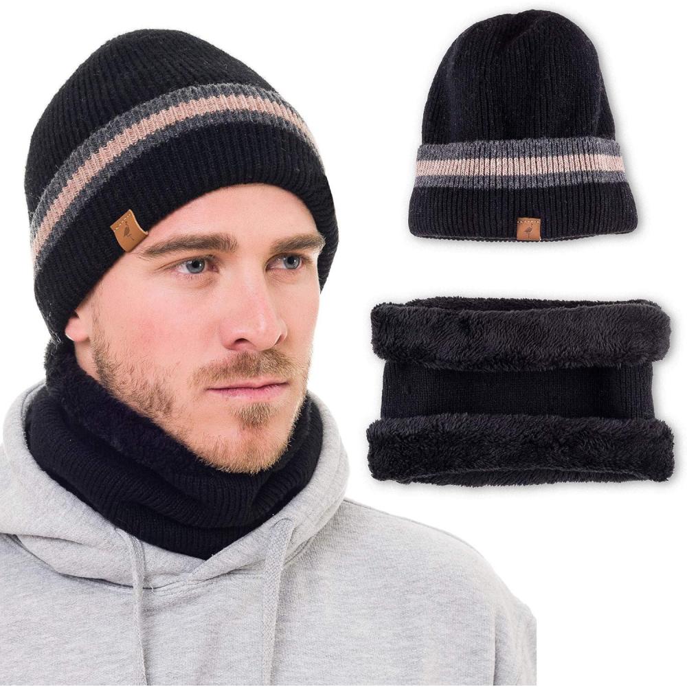 Beanie Neck Warmer Set with Wool Fleece Fur Scarf Gaitor Skull Cap Knit Hat Ski for Fall Winter(Black)