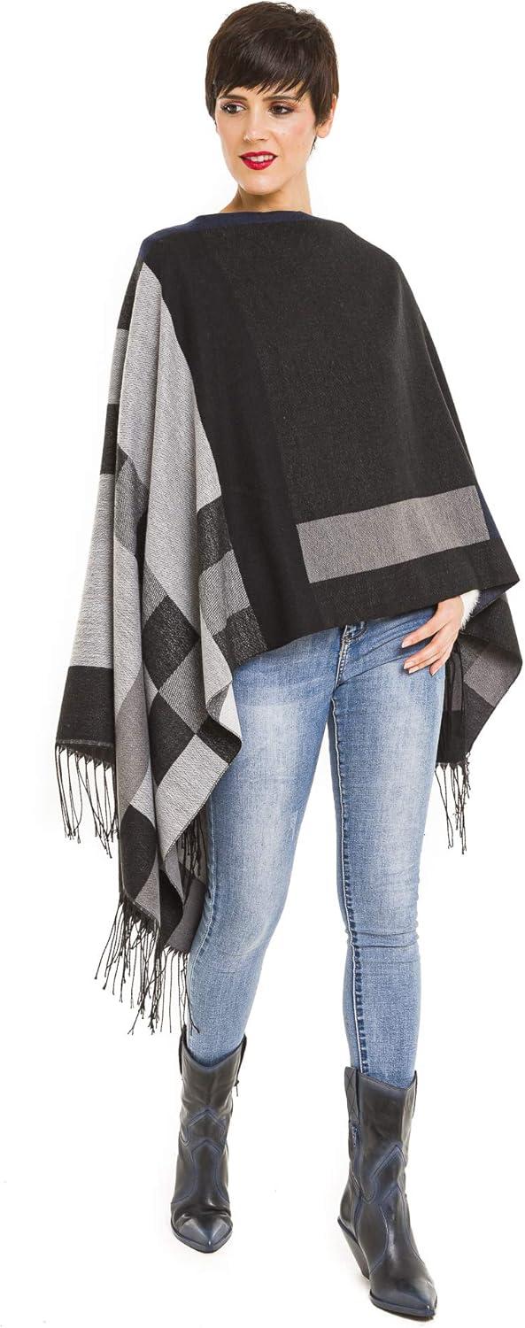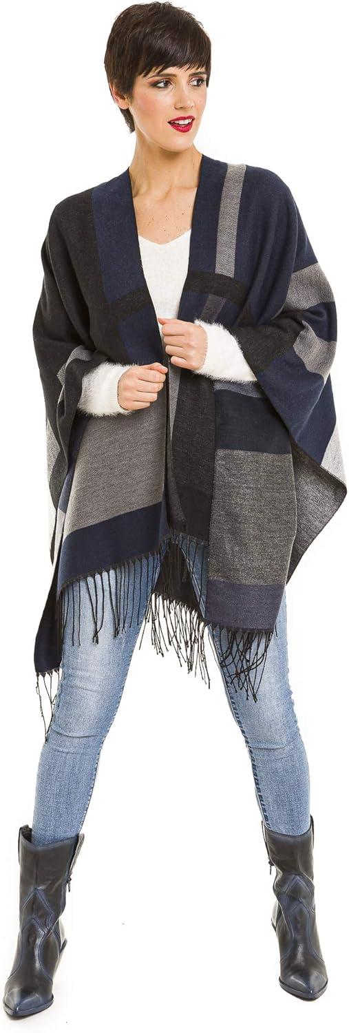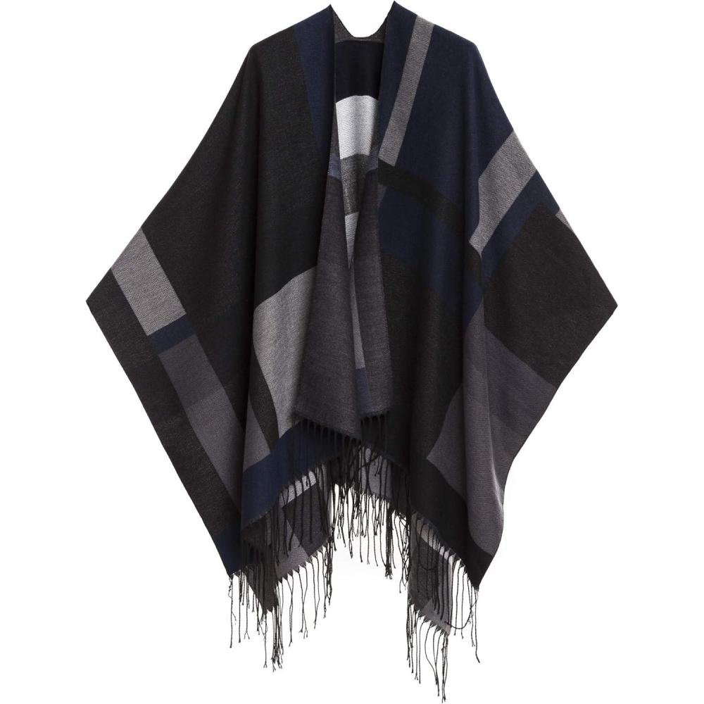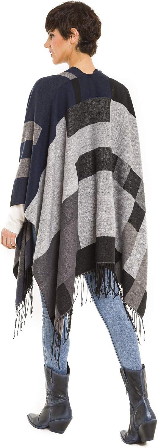 Cardigan Poncho Cape: Women Elegant Cardigan Shawl Wrap Sweater Coat for Fall Winter(Checker Design – Navy and Gray)