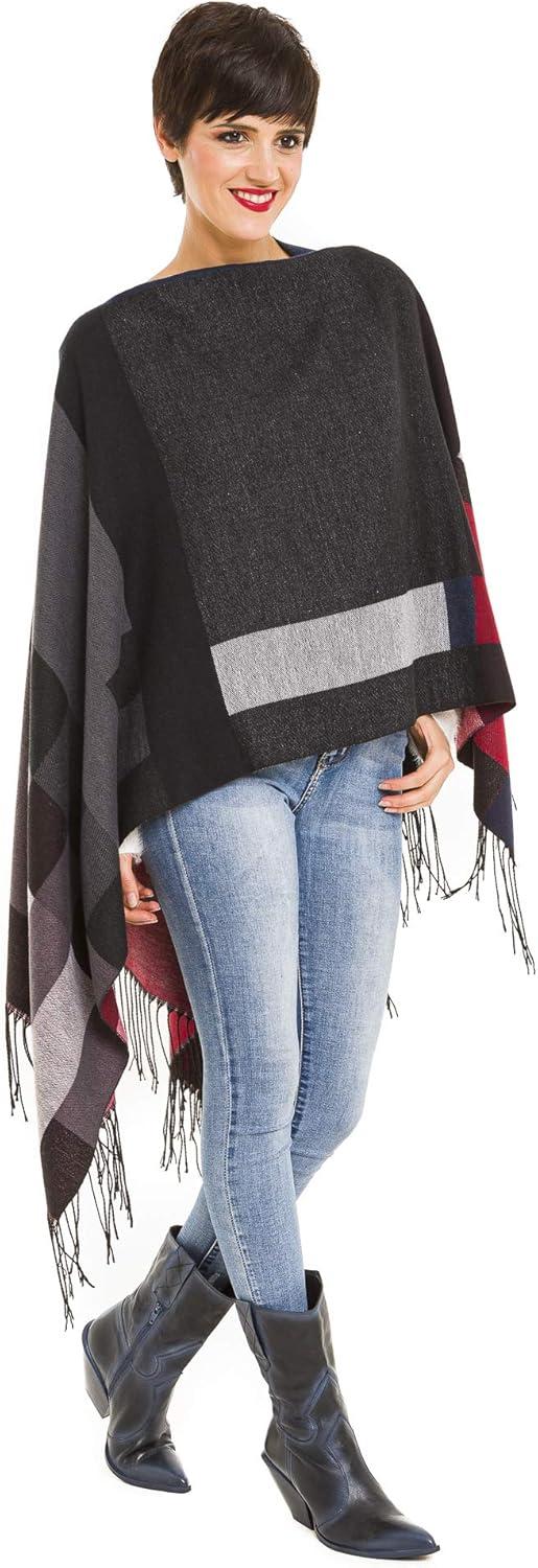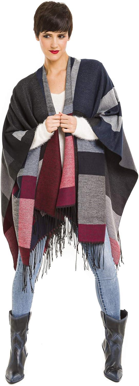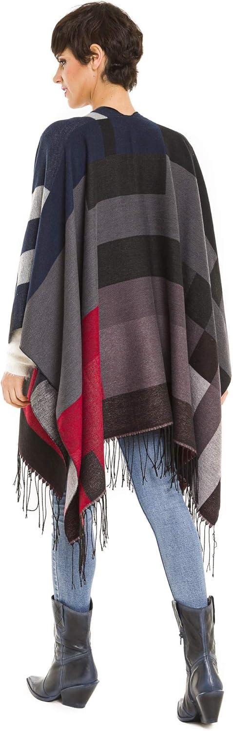 Cardigan Poncho Cape: Women Elegant Cardigan Shawl Wrap Sweater Coat for Fall Winter(Checker Design – Red Navy and Gray)