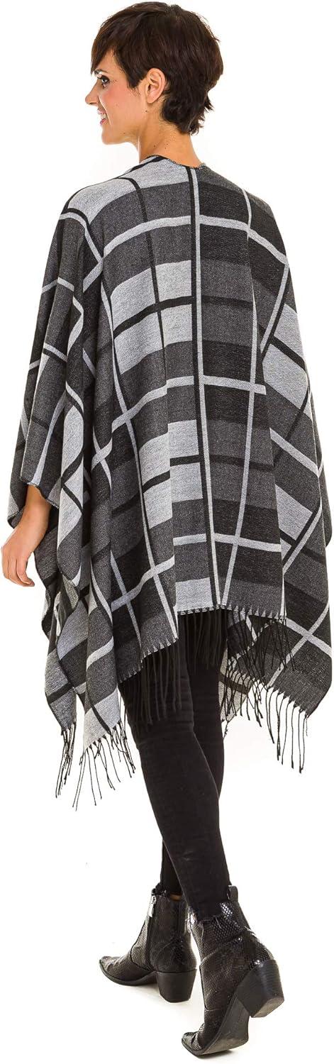 Cardigan Poncho Cape: Women Elegant Cardigan Shawl Wrap Sweater Coat for Fall Winter(Geometric Design – Double Gray Plaid)