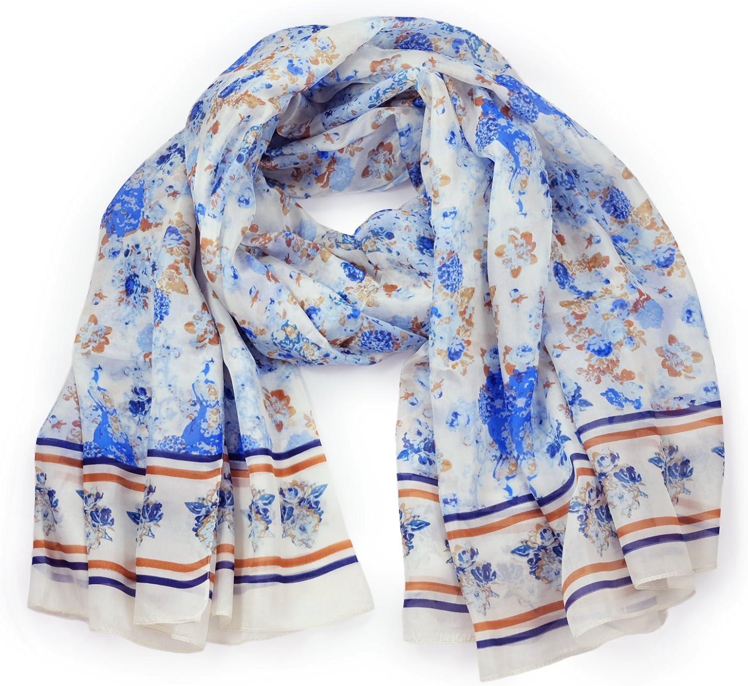 Scarf for Women 100% Silk Fashion Lightweight Shawl Wrap Scarves for Summer Fall(Jaen Collection 1 – Blue and White)